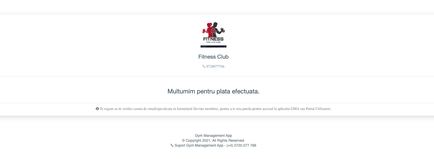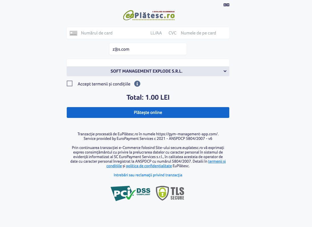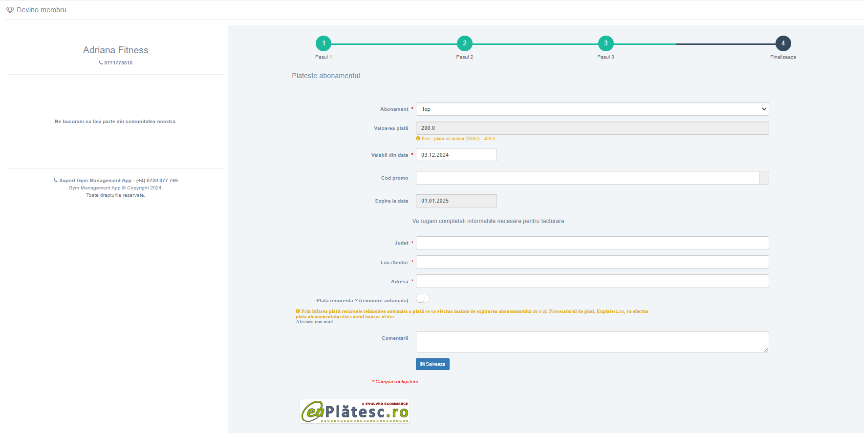 - Prin formularul de integrat în site-ul sălii de fitness (disponibil celor care au integrate plăți Online - de la Euplatesc.ro)