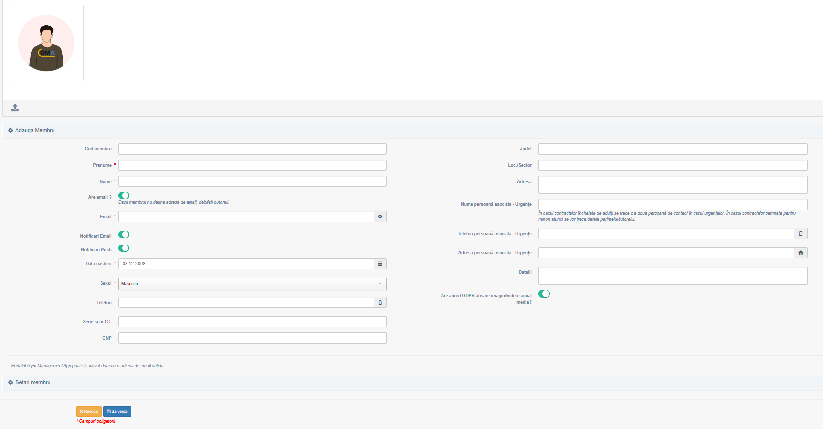- Cod Membru - folosit pentru scanarea cardului RFID din pagina Check-in rapid
