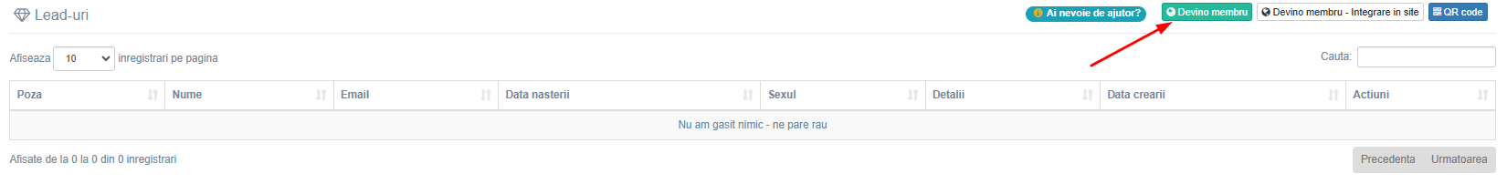 Pentru a putea accesa acest formular trebuie să mergeți la secțiunea Lead-uri din partea stângă și apoi să apăsați butonul Devino membru.