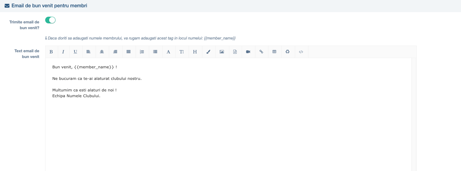 Pentru configurarea emailului de bun venit, accesați secțiunea Setări cont.