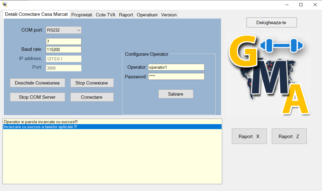 În câmpul Operator se introduce valoarea operator1 și la Password 0001 și apăsați pe butonul Salvare.