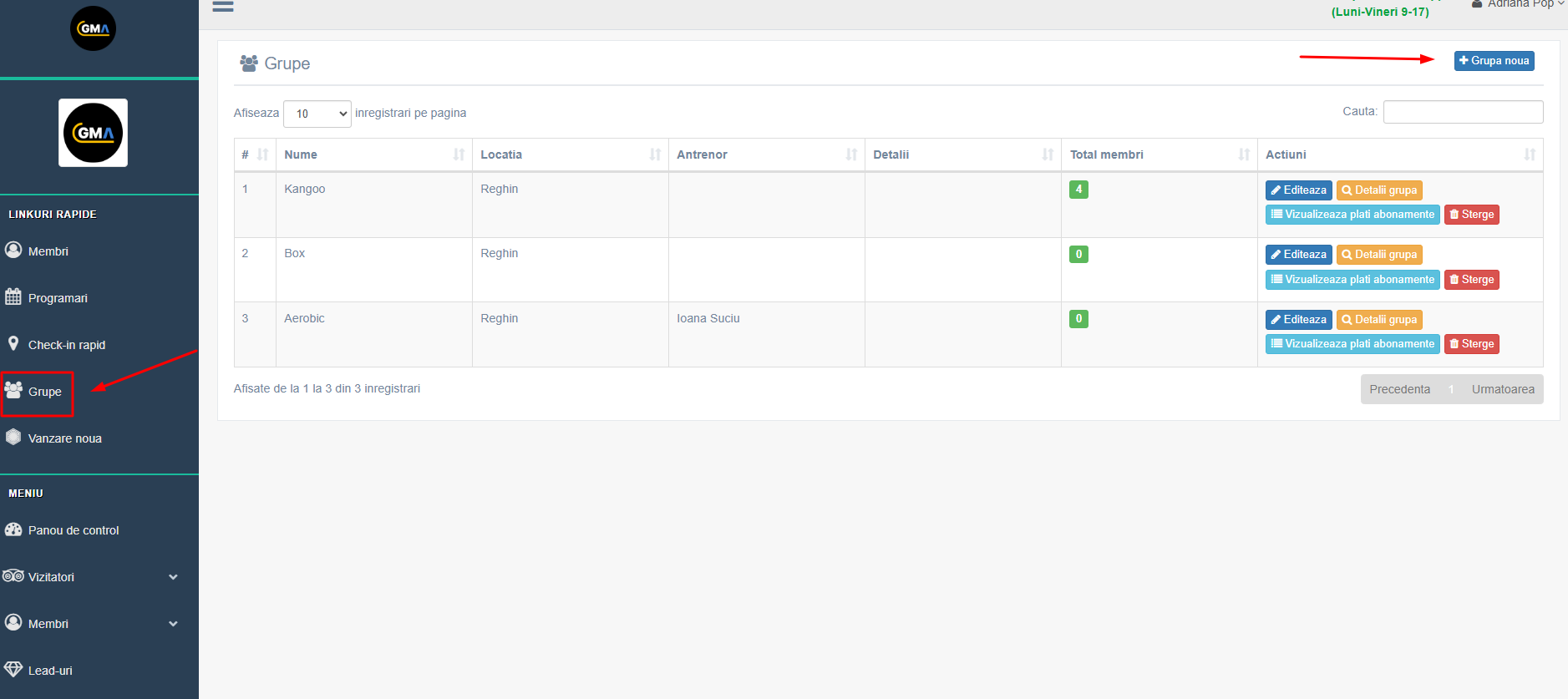 Pentru a putea crea/adăuga grupe, mai întâi trebuie să țineți cont de faptul că trebuie să aveți înregistrați utilizatori cu rol de antrenor!