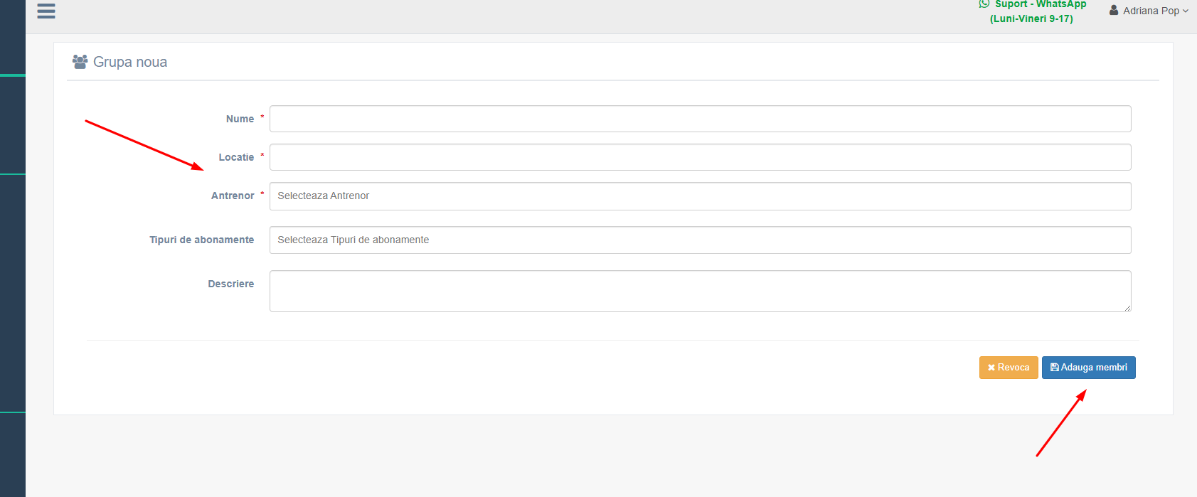 Aici este necesar să completați câmpurile obligatorii (nume, locație, antrenor), după care apăsați butonul Adaugă membri.