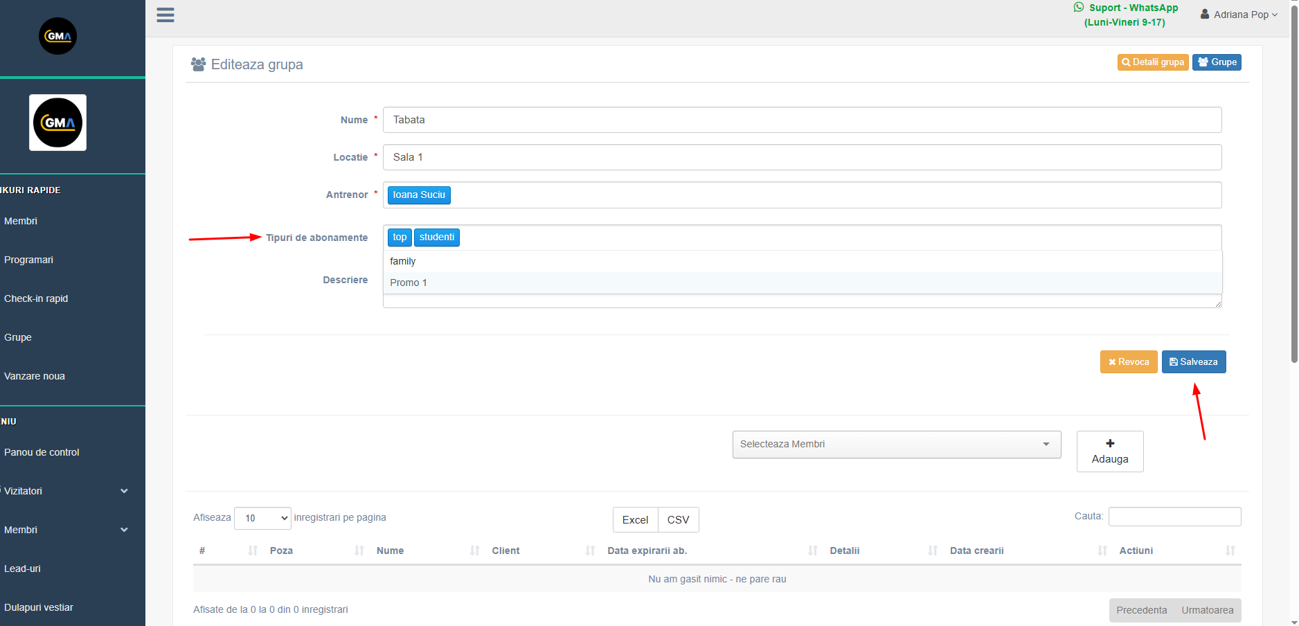 Apoi trebuie să selectați tipurile de abonamente (acele abonamente care vor putea fi utilizate în grupa respectivă) și să apăsați butonul Salvează.